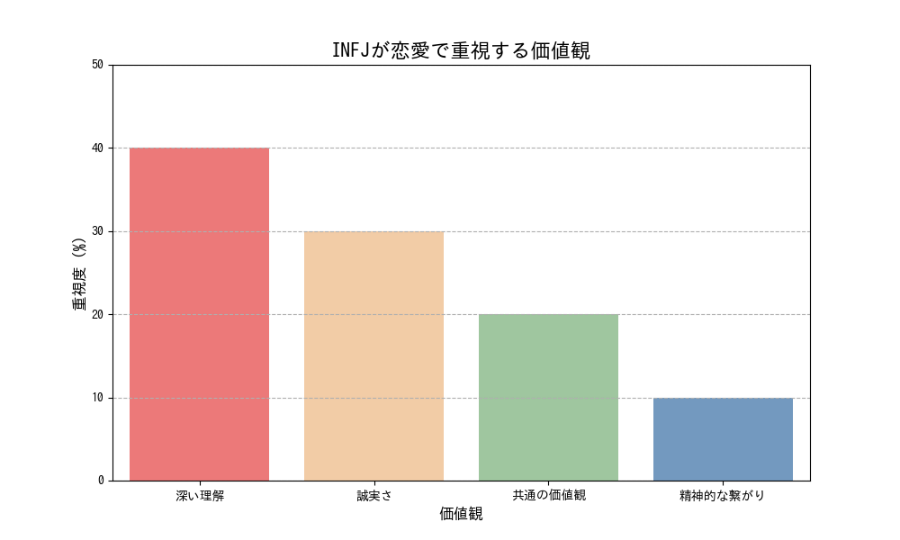 このグラフが示すように、INFJ 性格は「深い理解」を何よりも重視します。この価値観を共有できる相手を見つけることこそ、幸せな恋愛への鍵です。マッチングアプリは、INFJ 性格のあなたのための出会いがきっとあります。