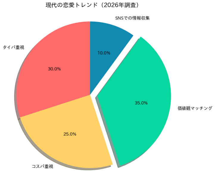 このグラフからもわかるように、「価値観マッチング」を重視する人が全体の35%を占めていて、これはタイパ重視(30%)やコスパ重視(25%)を上回る結果なんだ。つまり、見た目や条件だけでなく、内面的な繋がりを求める傾向が強まっているってことだね。