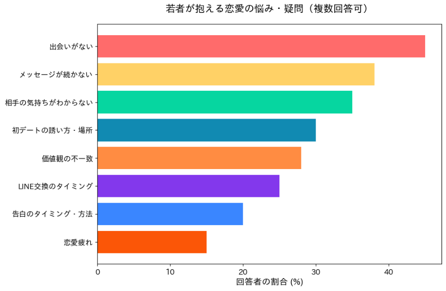 この棒グラフを見ると、「出会いがない」が45%でトップ。次いで「メッセージが続かない」(38%)、「相手の気持ちがわからない」(35%)と続くね。やっぱり、出会いのきっかけや、関係構築の段階で悩む人が多いみたい。